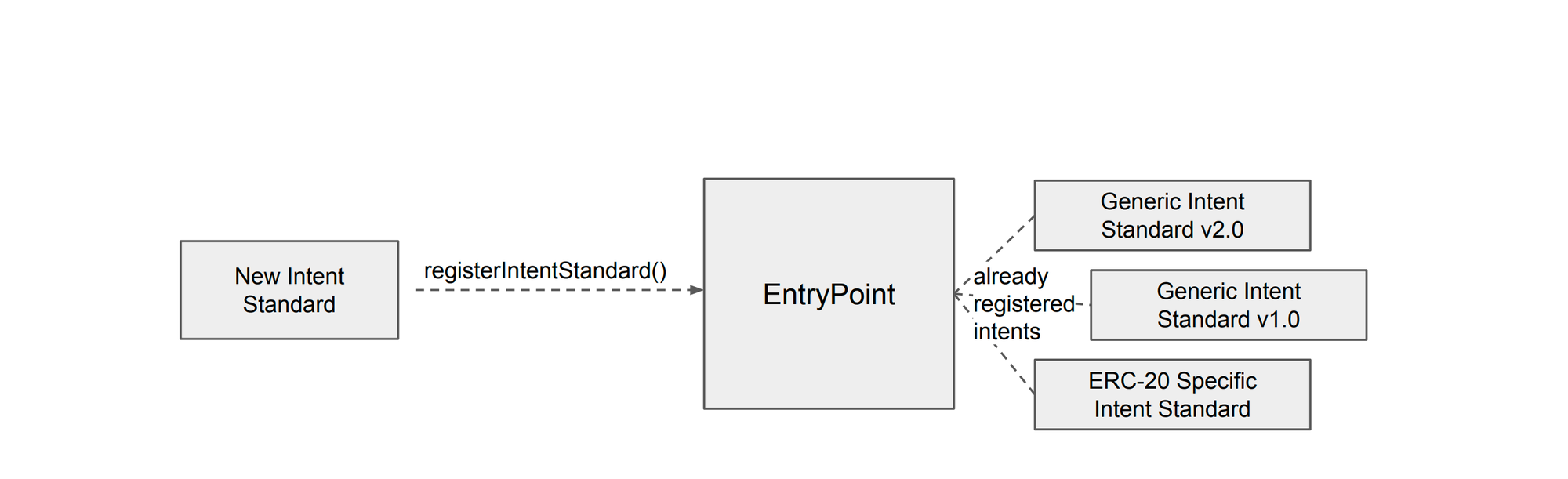 Many Intent Standards can exist simultaneously, and it’s up to users at intent signing time to opt in to a specific standard. Intent Standards are registered to the Entry Point in a completely permissionless way and enable generalized intents to stay up to date with the latest use cases for intents.