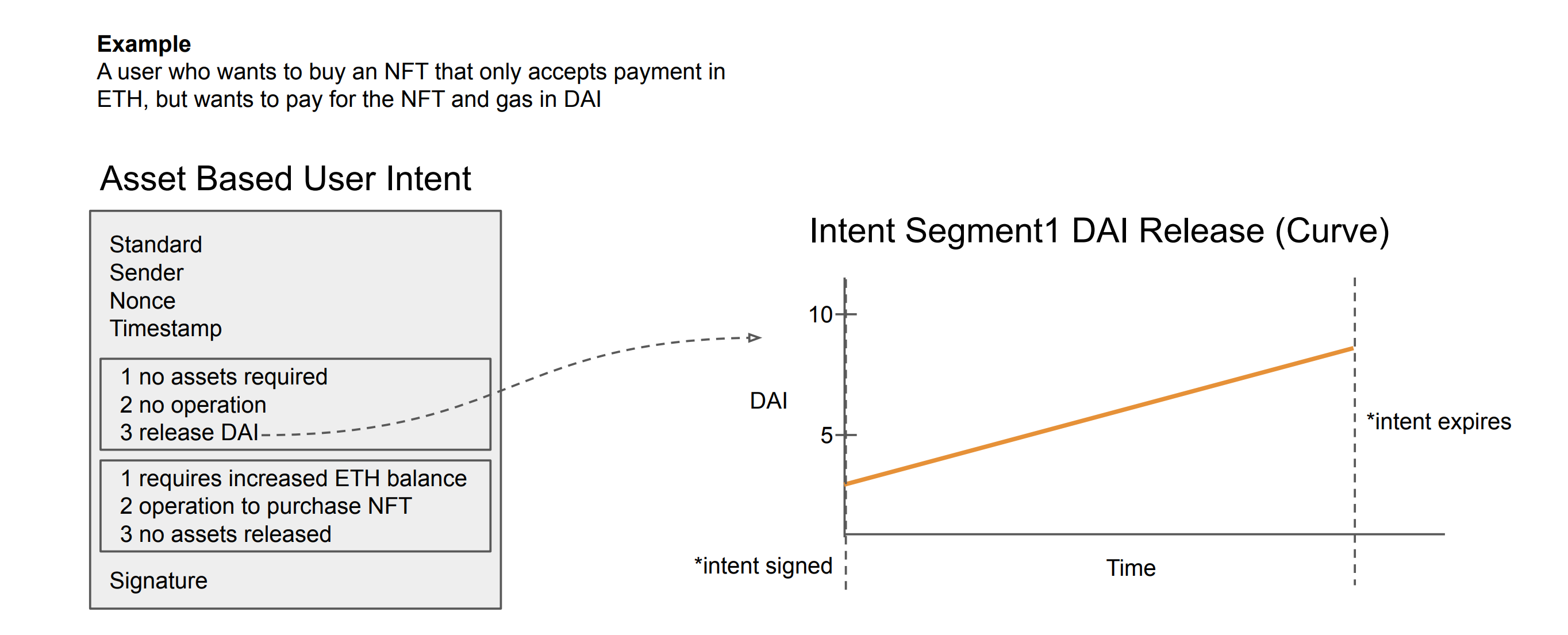 The evolution of this standard came about as our team recognized similarities across current use cases of intents, with the driving focus being on digital asset ownership and transfers. These types of intents range from simple actions like token swaps or portfolio rebalancing, to more specific preferences - for example, a user who wants to buy an NFT that only accepts payment in ETH, but wants to pay for the NFT and gas in DAI.