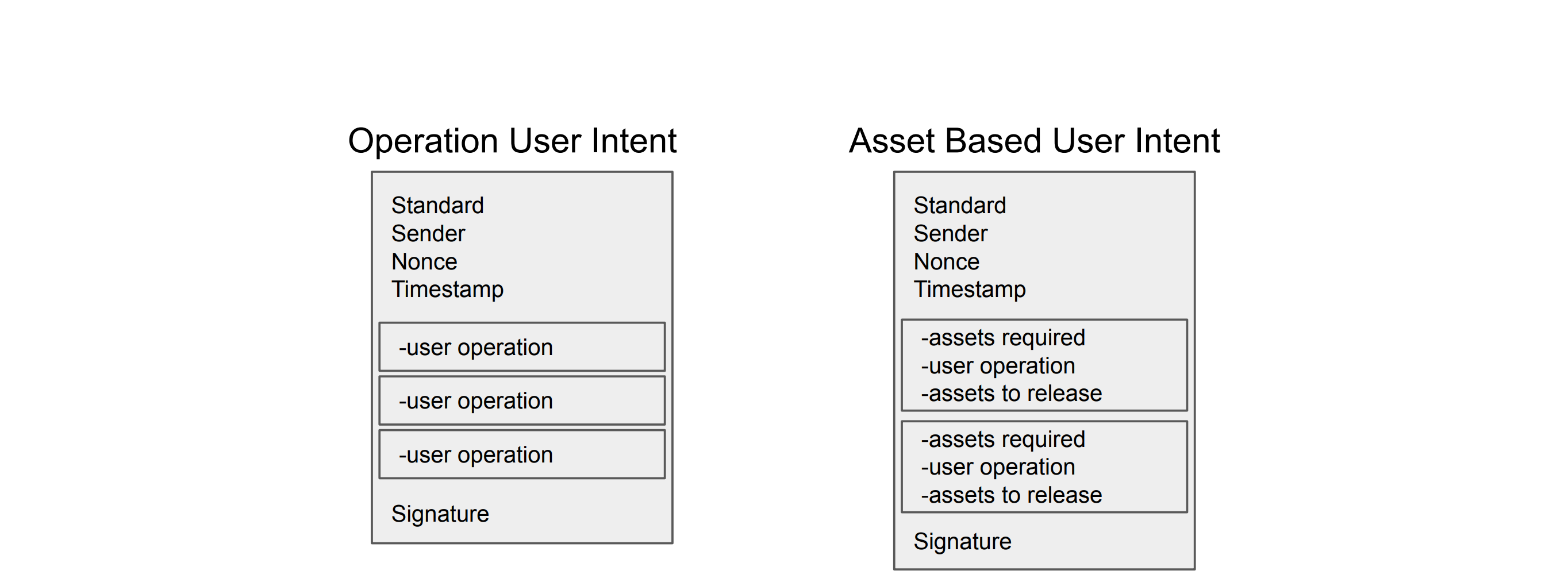 This basic standard is referred to as the Operation Intent Standard, as it mimics the simple UserOperations found in the ERC-4337 Account Abstraction spec. This Intent Standard has been further optimized by being baked into the Entry Point contract of ERC-7521 itself, since it is integral in submitting intents.