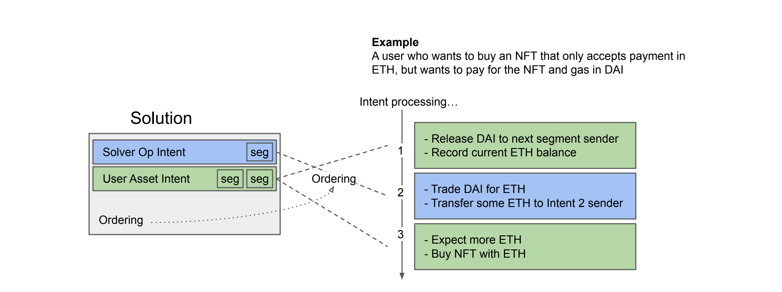 Also, required assets can be specified in terms relative to what the balance was when the previous Segment was processed. This allows to users to express their intents in a more natural and flexible way (such as the example below, where a user is expecting to release 5 DAI and be given enough ETH to purchase an NFT, regardless of their starting ETH balance). This also allows for signing multiple intents that can be processed in any order, since a user doesn’t have to write intents expecting exact values but rather some amount more or less than the start of processing.