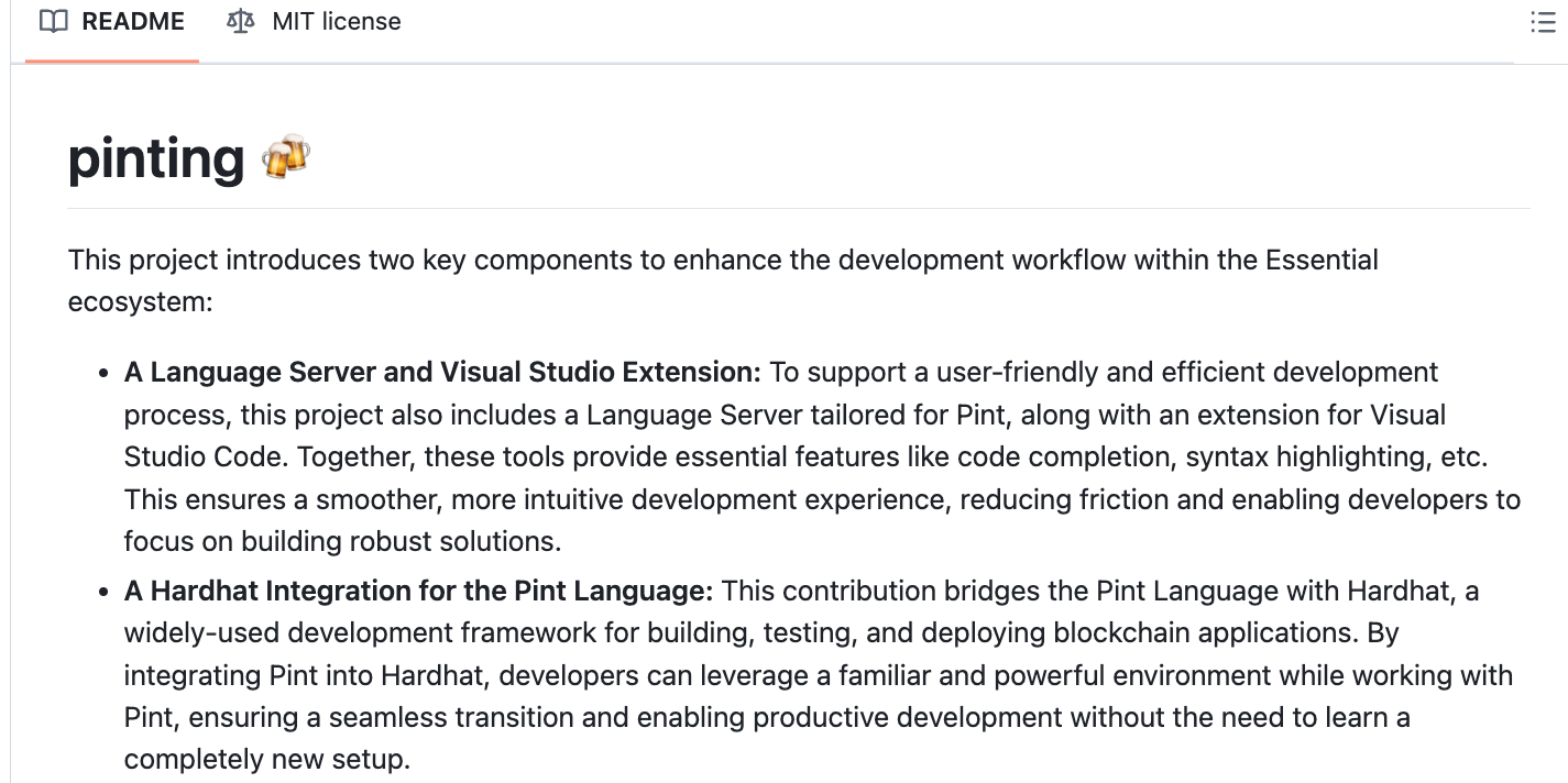 - Together, these tools create a smooth, developer-friendly experience, making it easier to adopt the Pint language within the Essential ecosystem.