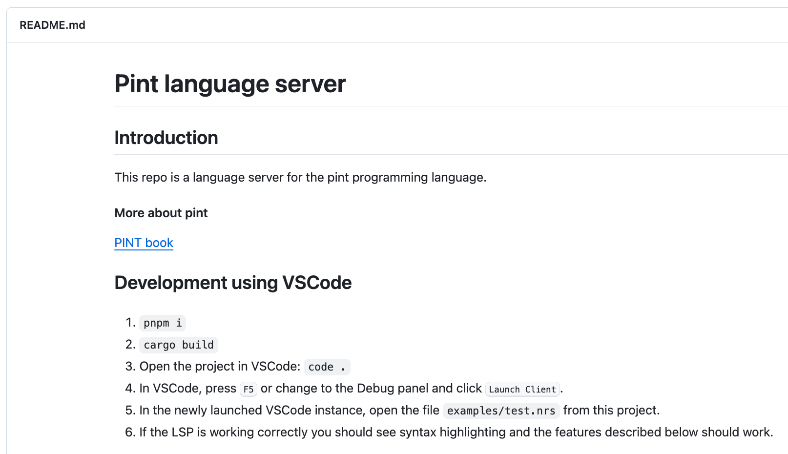 - To streamline the development process, the team created a prototype Language Server for Pint, built in Rust using the tower-lsp library and integrating the Pint compiler (