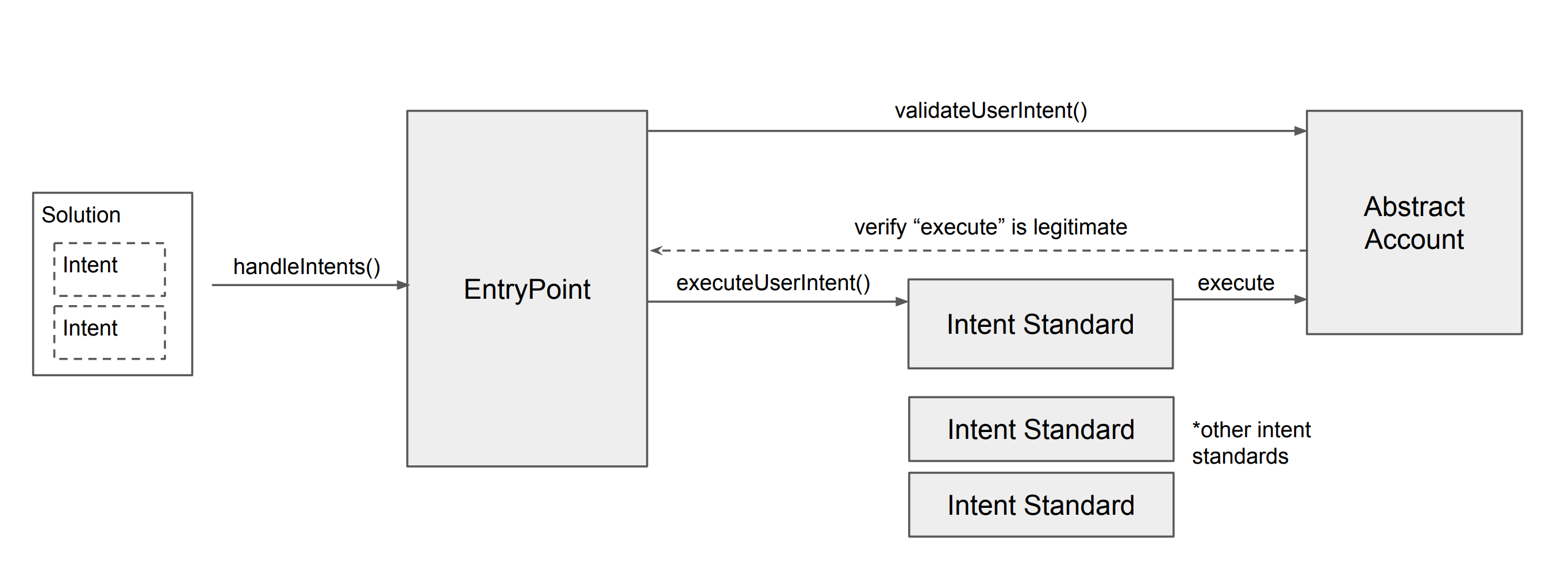 The specifics of the intent handling logic are defined in separate contracts, referred to as Intent Standards, which is specified by the signed intent itself. The Entry Point calls out to these contracts in order to process an intent. It is the Intent Standard that defines how additional intent data and execution should be handled, as well as basic off-chain rules such as how messages are to be communicated to solvers and protection mechanisms against DoS attack vectors inherent with intents.