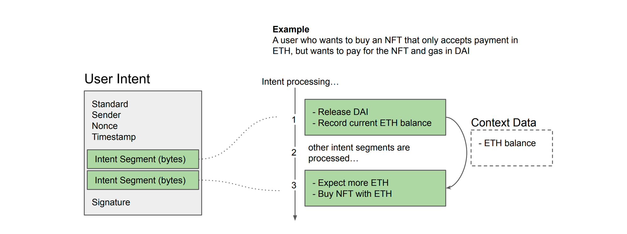 The focus of this spec is to define the basic framework for smart contract wallets to connect to and unlock powerful intent expression for their users even as the landscape continues to evolve. Defining an intent as a collection of smaller intent Segments provides a good user experience with a reduction in the amount of signing users need to do. The intent Segmenting and shared Context Data also helps to unlock powerful features without high gas usage. Intents can trust that all their Segments will be processed in order without having to manually check.