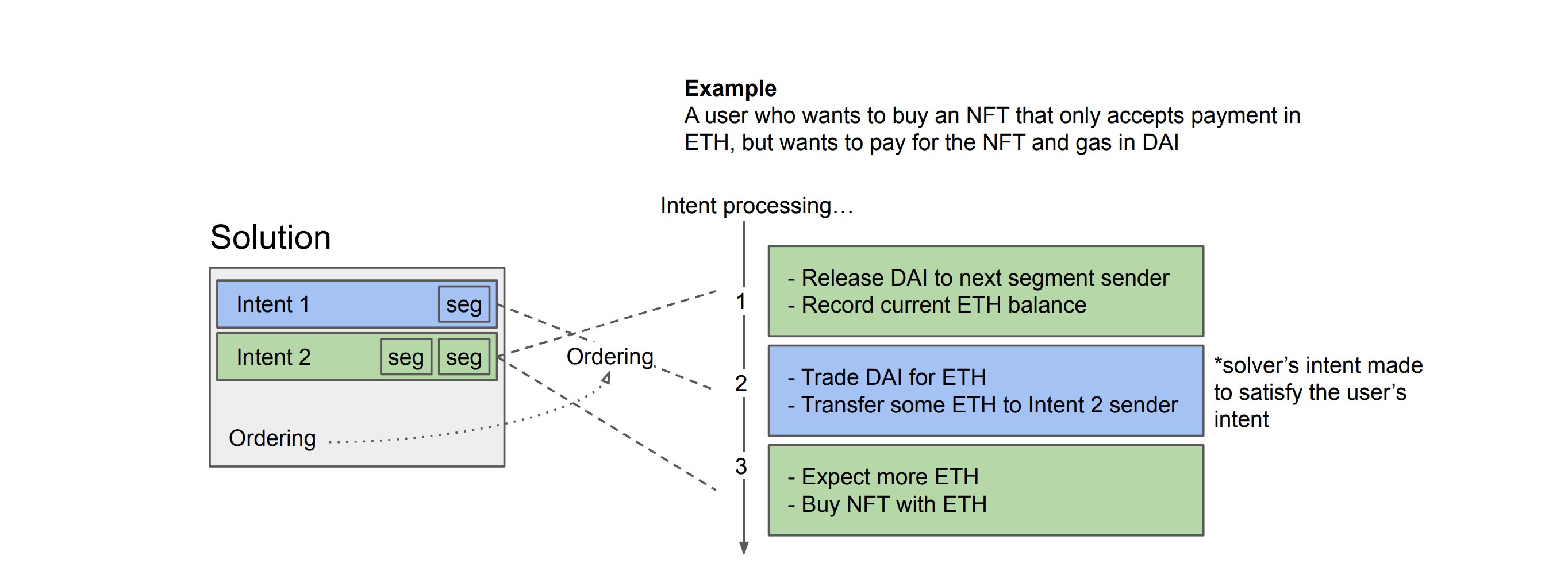 However, it's not enough to just submit a list of intents, because the segments of different intents can be arranged in different orders. Therefore a Solution also specifies how the segments of different intents should be ordered during processing (how segments of different intents are interleaved).