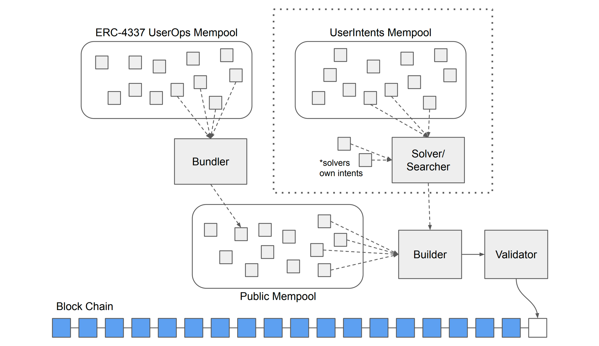 A combination of on-chain operations that result in all parties being satisfied is referred to as a Solution. Specialized solvers (akin to bundlers in ERC-4337) will compete to find solutions that provide the highest satisfaction level to users. This may be done for example by finding the best/most efficient on-chain pathway, leveraging off-chain sources of liquidity, combining different users’ intents to leverage coincidences of wants, and even including their own intents.